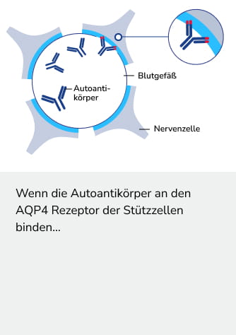 Grund dafür sind bei ca. 75 % der NMOSD-Patient:innen sogenannte Autoantikörper (AK). Diese richten sich nicht wie normale Antikörper gegen Krankheitserreger, sondern gegen ein bestimmtes körpereigenes Eiweiß: dem Wasserkanalprotein Aquaporin-4 (AQP4).9 Dieses Protein reguliert den Wassertransport bestimmter Körperzellen - vornehmlich bei bestimmten Zellen des Nervensystems (sogenannte Stützzellen), welche vor allem im Gehirn und Rückenmark vorkommen.8
